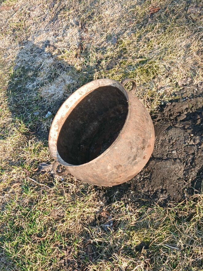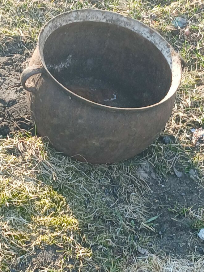 Stary żeliwny kociolek do renowacji lub jako ozdoba,w ogrodzie lub przy kominku,stan jak na zdjęciach, lekko wyszczerbiony,u góry, nie przepalony,nie pęknięty.Tomasz